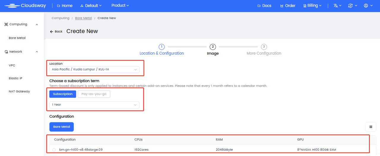 Binding to NAT: In the Malaysia region (KUL-1A), EIP can only be bound to NAT, using NAT as the network exit for the bare metal server.