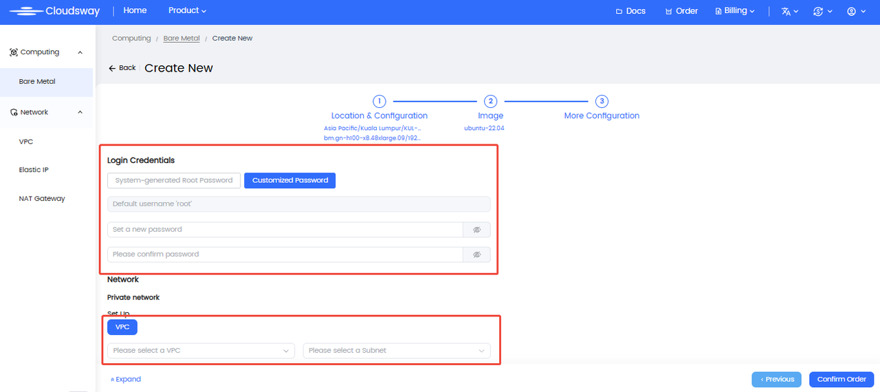 Special Note: In the Malaysia region (KUL-1A), the internal subnet range needs to be entered according to the recommended network.
