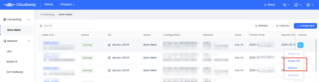 - Power On/Off / Restart: Click the operation button on the resource list page, status will sync in real-time.