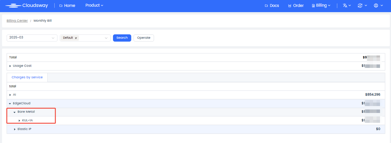 Go to the “Billing” page in the console, choose resource types (bare metal, Elastic IP), and view the bill.