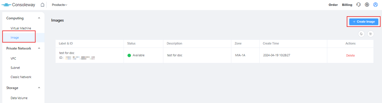 - On the left menu bar, go to Computing >Image, and click on the Delete button next to the corresponding Image you would like to delete. You are prompted to confirm deletion of the Image. Click Delete to proceed.