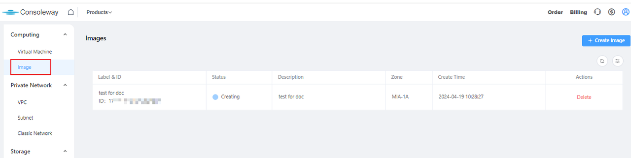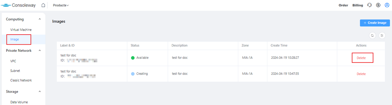 - 在左侧菜单栏中,点击计算 > 镜像,然后点击对应镜像右侧的删除按钮。系统会提示您确认删除操作。点击删除以继续