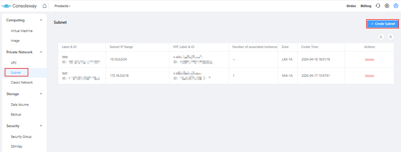在左侧菜单栏中,点击私有网络 -> 子网,然后点击对应子网右侧的删除按钮。系统会提示您确认删除操作。点击删除以继续。